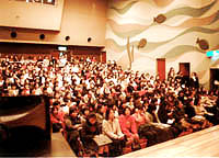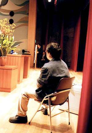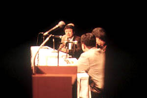 某女子大にて講演。 立ち見も出るほどの盛況でした。 写真は、講演の内容を確認する獏さん。登壇前の獏さん。満員の聴衆。 |